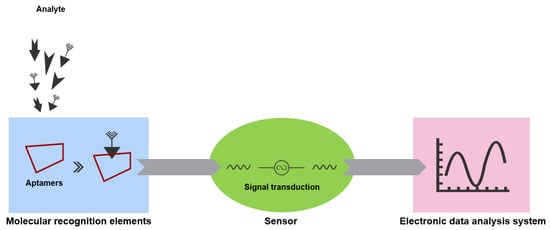 In general, a conventional biosensing device can be broadly defined as a device that converts physical, chemical, or biological events into measurable signals. Biosensors consist of three main components: the biomolecular recognition element, the sensor, and the signal processing and data analysis system. A biomolecular recognition (sensing) element, usually borne by aptamers, antibodies, enzymes, proteins, cellular receptors, tissues, microorganisms, etc., is a biologically derived material or biomimetic element that provides selectivity for a target molecule or a target substance. Sensors can convert molecular recognition events into measurable signals through different transduction mechanisms. After receiving these measurable signals, electronic data analysis systems process the signals accordingly and visualize the data obtained from these processes [49]. Aptasensors act as molecular recognition elements through aptamers because aptamers selectively bind to target molecules [50,51,52]. As shown in Figure 3, when a target molecule in a sample binds to an aptamer, this binding process is converted into a detectable signal through various mechanisms, which is then quantified by the sensor element. Subsequently, the presence of the target molecule in the sample or its specific concentration can be determined [53].