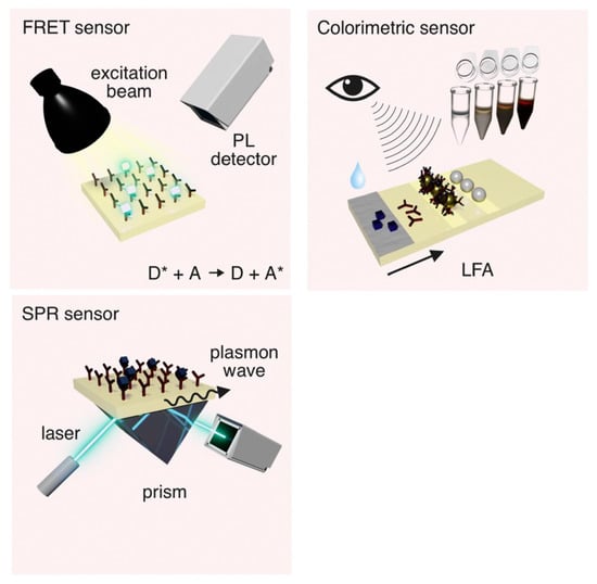 Optical aptasensors are new types of biosensors based on the use of nucleic acid aptamers as recognition elements, combined with the development of optical detection technology. Optical aptasensors work by capturing signals generated by the interaction of a biometric element with a target molecule and converting the signals into optical signals that are subsequently detected and analyzed [95]. Optical aptasensors use an optoelectronic transduction which allows for rapid and highly sensitive detection and have been widely used in the fields of clinical diagnosis, environmental monitoring, and food safety [96,97,98,99]. Below, the focus will be on fluorescent aptasensors, colorimetric aptasensors, and surface plasmon resonance (SPR) aptasensors.
