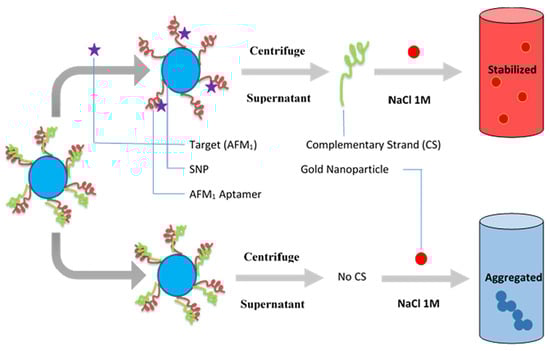 | Aflatoxin M1 (AFM1) | Preservation of AuNPs against NaCl-induced aggregation by detaching complementary strand (CS) from dsDNA-modified silica nanoparticles (SNPs) following the addition of target, and the colour of sample remains red; salt-induced aggregation of AuNPs occurs in the lack of AFM1, and the colour of sample becomes purple as dsDNA-modified SNPs are stable and CS cannot bind to AuNPs (as demonstrated in Figure 5) | Biotin-labelled AFM1 aptamer and its complementary strand (CS) immobilized onto the surface of silica nanoparticles (SNPs) through streptavidin–biotin (SA-Bio) interaction. Aptamers as recognition probe and AuNPs as colorimetric indicators | Colorimetric detection | 30 ng/L with a linear range of 300–75,000 ng/L | Simplicity (detected with the naked eye), better selectivity by using CS of aptamer | [120] |