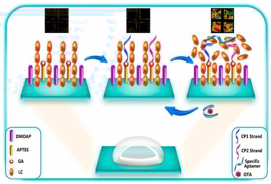 | Ochratoxin A (OTA, the most dangerous mycotoxin) | The aptasensing strategy was based on the conformational switch of the immobilized π-shaped DNA aptamer structure on the glass substrate in presence of the target; a shift in the orientation of LCs from random to homeotropic state led to the change in optical appearance of the sensor platform from bright to dark | Two complementary strands of aptamers (CPs) were first immobilized onto glass substrates, subsequently modified with DMOAP/APTES/GA, and then incubated with solution of OTA-specific aptamer for immobilization | Polarized light microscopy | Detecting OTA at the ultra-trace level as low as 0.63 aM | Portable and real-time sensing probes with high performance for food safety control and clinical application | [121] |
