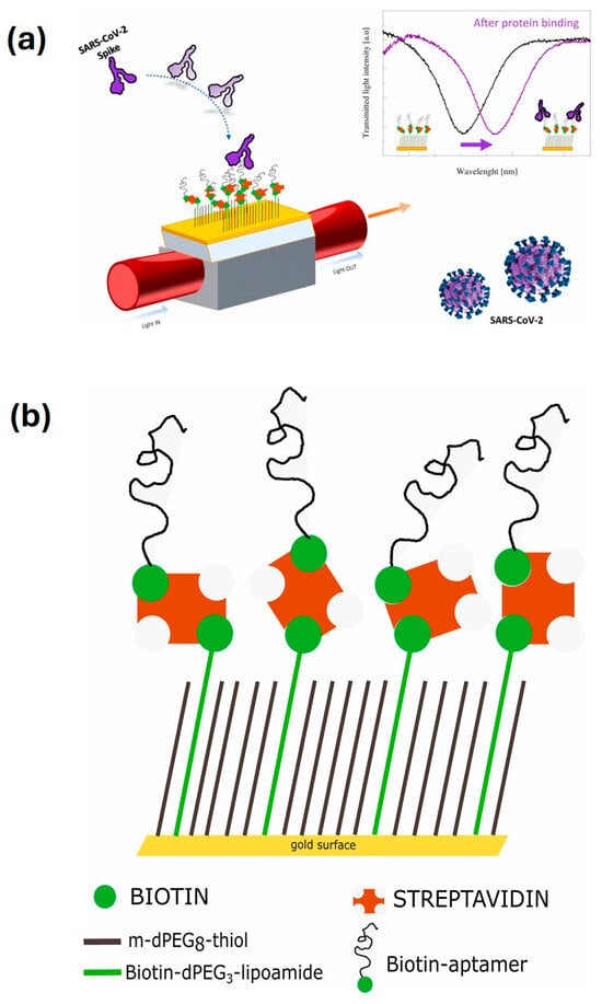 (Left) SARS-CoV-2 spike protein detection through a plasmonic D-shaped plastic optical fibre aptasensor. (a) Illustration of working principle of the SPR sensing based on red shift in resonance wavelength upon the binding between the aptamer and SARS-CoV-2 spike protein. (b) Illustration of immobilization of the aptamer. Reprinted with permission from Ref. [133]. Copyright 2021, Elsevier.