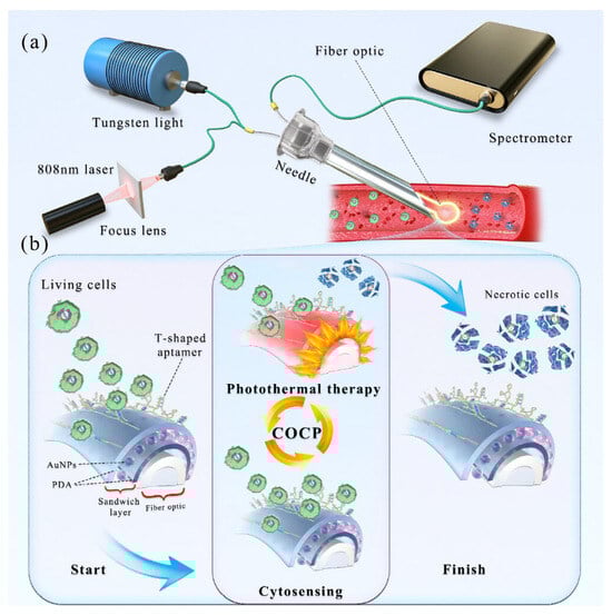 (Right) Illustration of the concept of a circuit of cytosensor–photothermal therapy (COCP) through a fibre optic (FO) LSPR-based aptasensor coating with a sandwich layer. (a) The set up of the FO-LSPR. (b) Working principle of the COCP for cancer cell capture, kill, and release. The sandwich layer was polydopamine/gold nanoparticles/polydopamine (PDA/AuNPs/PDA). Reprinted with permission from Ref. [134]. Copyright 2024, American Chemical Society.