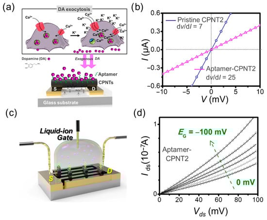 (a) Illustration of cell exocytosis for dopamine (DA) release from PC12 cells via rapid Ca2+ reflux, accelerated by K+ ions (upper) and liquid-ion gated FET aptasensors, using aptamer-conjugated CPNTs for exogeneous DA detection (down). (b) Current-voltage (I-V) curves of CPNT2 before and after the introduction of aptamer. (c) Schematic illustration of liquid-ion gated aptasensors using CPNTs on the interdigitated microelectrode (IME) array. (d) Output characteristics of liquid-ion gated aptasensors with CPNTs. S and D in (a) and (c) stand for source and drain, respectively. Adapted from Ref. [76]. Copyright 2020, the Springer Nature.