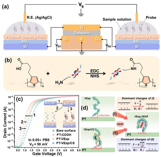 (a) Schematic of the remote dual-gated FET sensing system: the two remote gates are connected in parallel to the gates of commercial transistors. (b) Functionalization of the PT-COOH film with probe VEap/CS to form PT-VEap sensing surface on the remote gates using EDC/NHS chemistry. (c) Representative transfer curves of FETs with remote gates in a 0.05 × PBS buffer solution: bare surface, PT-COOH, PT-VEap, and PT-VEap/CS. The single-strand blue line represents VEap, while the red–blue double-strand chain represents VEap/CS. (d) Proposed mechanisms of VEGF responses on PT-VEap (Process I) and PT-VEap/CS (Process II) as remote gates of FET sensors. The primary change in Process I is attributed to the conformational folding of VEap upon VEGF binding, which reduces the separation distance between the plates of the model capacitor. The primary effect in Process II is attributed to the release of the CS along with VEGF binding to VEap, leading to a decrease in the charge stored in the model capacitor. Adapted from Ref. [168]. Copyright 2025, Elsevier.