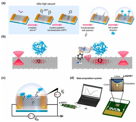 (a) Protocol to develop a covalent graphene solution gated field-effect transistor (g-SGFET) aptasensor. The protocol is a two-step process carried out in UHV: i) the creation of single-atom vacancies in the graphene layer of the transistor with an Ar+ ion sputter gun; ii) the evaporation of Langmuir of p-aminothiophenol (pAPT). Then, the platform is functionalized with the selected aptamer specific to the Hepatitis C virus (HCV) core protein. The two final steps are not carried out in UHV but in a liquid environment. (b) Molecular antenna effect: the covalently bound pATP linker acts as a molecular antenna enhancing the local polarization of graphene due to the proximity of the aptamer/protein system, setting the position of the Dirac cone. (c) g-SGFET functioning scheme: The g-SGFET contains three terminals: the source, drain, and gate electrodes, and the active channel formed by graphene. The charge carriers (electrons or holes) flow through the active channel from the source to the drain. The gate modulates the channel conductivity by applying a gate voltage that moves the graphene Fermi energy up or down in the density of states for positive or negative voltages. (d) Real image and dimensions of the g-SGFET wire-bonded to a printed circuit board (PCB) inserted into an electronic platform that can communicate with a computer where the measured data are displayed. Adapted from Ref. [171]. Copyright 2023, Elsevier.
