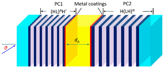 Schematic of the designed asymmetric photonic structure with the number of periods of the alternating dielectric layers, N = 6. The structure consists of two DBRs sandwiching a cavity with two interfacing metallic (e.g., Ag) films. The analyte layer is positioned at the center of the structure to fill the cavity, with a thickness of dA = 1 μm.