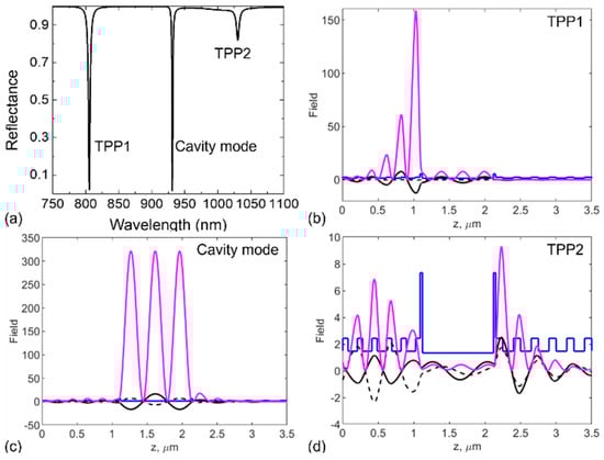 As depicted in Figure 2a, the reflectance spectrum of the designed device structure demonstrates three distinct resonance signals within the wavelength range of 750–1100 nm. These spectral lines correspond to two TPP modes and a cavity mode in between. The detailed electric-field distributions of these modes are illustrated in Figure 2b–d, high-lighting their unique field-localization characteristics. The first resonance mode, TPP1, as shown in Figure 2b, exhibits strong field confinement at the metallic-dielectric interface. This mode, a hallmark of TPP excitation, results from electro-magnetic field localization at the interface between the metal and the DBR. The high reflectivity of the DBR and the negative permittivity of the metal combine to facilitate the formation of a confined TPP mode with requirement of the phase-matching condition.