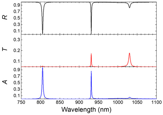 Reflectance (R), transmittance (T), and absorptance (A) spectra of the photonic structure in the near-infrared range. The spectra highlight three distinct resonance modes at 805 (TPP1, Figure 2b), 931 (Cavity mode, Figure 2c), and 1030 nm (TPP2, Figure 2d), with complementary features observed between reflectance and transmittance, and enhanced absorption at resonance wavelengths for an analyte with na = 1.335. The PBG of initial PC1 and PC2 are overlapping the same way as in Figure 2 in Reference [43].