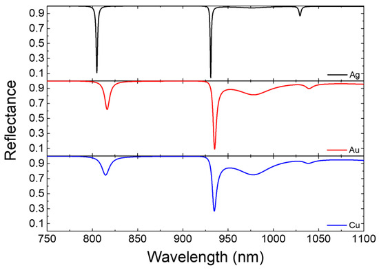 Figure 4 shows the reflectance spectra of three photonic structures, each consisting of a different metallic material (Ag, Au, and Cu from top to bottom). Outside the three wavelengths of resonance, the use of silver consistently maintains good contrast, whereas the choices of both gold and copper for the metal films worsen the contrast, bringing about spurious signals around 1000 nm and compromised spectral clarity. These spurious signals hinder accurate signal interpretation and reduce the overall signal-to-noise ratio, posing a crucial challenge for the functionality of the sensing device. The superior optical performance of Ag can be attributed to its higher electrical conductivity and lower intrinsic absorption losses in comparison with those of Au and Cu. These material properties enable Ag to suppress non-resonance energy dissipation while preserving high reflectance outside resonance regions. This critical feature enhances photonic devices by ensuring consistent optical performance across a broad spectrum, boosting reliability, sensitivity, and precision.