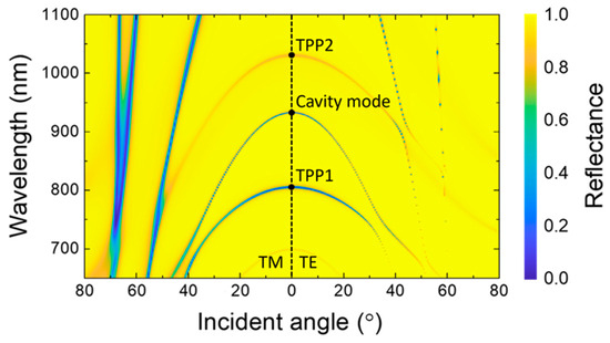 Angular-dependent reflectance spectra of the proposed structure for TM- and TE-polarized waves. The spectra illustrate the reflective behavior of the device as a function of the incident angle, highlighting angularly tunable resonance modes and their distinct responses for TM and TE polarizations. The figure delineates the evolution of reflectance over a range of incident angles θ, emphasizing the interplay between resonance modes under different polarization conditions.