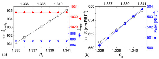 The responsiveness of the asymmetric PC1-M-A-M-PC2 photonic structure to varying na is exhibited in Figure 6, where na ranges from 1.335 [5] at glucose concentrations of 0–15 mg·dL−1 in human urine to 1.341 at 5 g·dL−1, representing a theoretical model of refractive index variations associated with physiological and elevated glucose levels. These values can be used to evaluate the structure’s performance under realistic sensing conditions. As shown in Figure 6a, the TPP modes display minimal sensitivity to variations in na, thus ensuring reliability as a reference for calibration in reflectance-based sensing applications. Conversely, the cavity mode exhibits significant shifts in its resonance wavelength in response to changing na, highlighting its capacity for high-sensitivity detection. The collective manifestation of these characteristics is indicative of the devised structure’s capacity to facilitate both stable reference modes and highly responsive sensing capabilities. The sensitivity of the system can be determined using the following equation:
