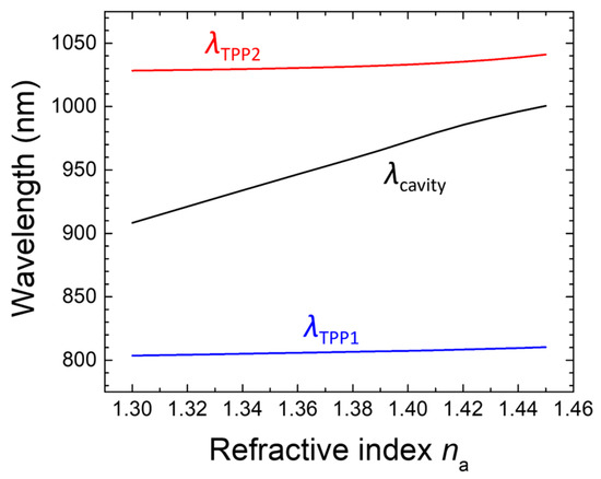 The TPP1 mode is characterized by its strong localization at the metallic–dielectric interface and negligible transmission. This renders TPP1 an optimal reference line at 805 nm in reflectance spectra additionally due to its stability or minimal sensitivity to variations in refractive index of the analyte layer (to be discussed later). Conversely, the cavity mode, with its substantial field enhancement within the analyte layer, exhibits a balance between reflectance and transmittance. It is susceptible to changes in na to enable precise analyte detection, which is critical for label-free sensing applications. The TPP2 mode, occurring at a longer wavelength at 1030 nm, displays moderate transmission. Likewise, its stable spectral-line properties make TPP2 another suitable reference in the transmission spectrum for sensing. The functional duality of TPP1 and TPP2 as references in spectral reflectance and transmittance, respectively, allows the outlined structure to achieve self-referenced sensing capability.