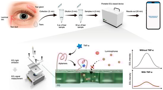 An illustration of the portable electrochemiluminescence (ECL)-based device designed to measure TNF-α for point-of-care assessment of dry eye syndrome (DES).