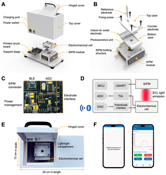 (A) An expanded view of the portable ECL-based device assembly. (B) Structural details of the electrochemical cell and SiPM module. (C) A photograph of the printed circuit board integrated within the device. (D) A block diagram of the portable ECL-based device. (E) A photograph of the assembled device. (F) A photograph of the developed smartphone application.
