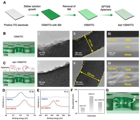 (A) A schematic illustration of the preparation of the VSM/ITO electrode and aptamer-functionalized VSM/ITO electrode (Apt-VSM/ITO). (B) TEM and SEM characterization of the VSM/ITO electrode. (i) Top-view TEM image of VSM. (ii) Cross-sectional TEM image of VSM. (iii) Cross-sectional SEM image of VSM/ITO electrode. (C) TEM and SEM characterization of the Apt-VSM/ITO electrode. (i) Top-view TEM image of Apt-VSM. (ii) Cross-sectional TEM image of Apt-VSM. (iii) Cross-sectional SEM image of Apt-VSM/ITO electrode. (D) High-resolution Si 2p spectra of the VSM/ITO and Apt-VSM/ITO electrodes. (E) High-resolution N 1s spectra of the VSM/ITO and Apt-VSM/ITO electrodes. (F) The zeta potential of the bare ITO, VSM/ITO, and Apt-VSM/ITO electrodes at pH 7. (G) A schematic illustration of VSM hydrolysis.