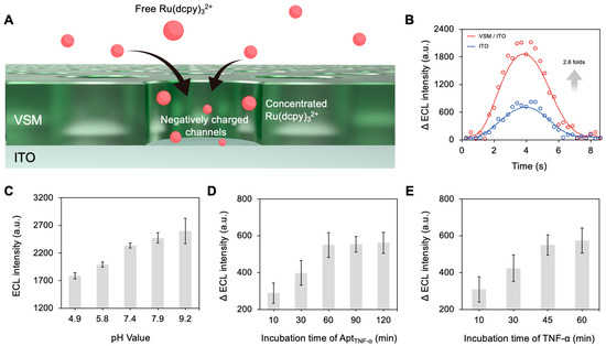 (A) A schematic illustration of ECL luminophore enrichment in VSMs. (B) The ECL signals of the bare ITO and VSM/ITO electrodes in 0.01 M PBS containing 50 μM of Ru(dcpy)32+. (C) Optimization of pH. (D) Optimization of the incubation time for the TNF-α-specific aptamer. (E) Optimization of the incubation time for TNF-α.