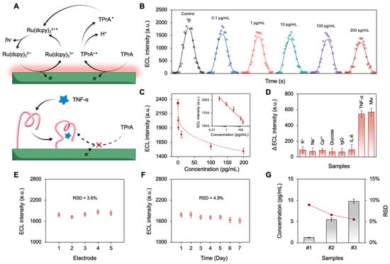 (A) Device sensing mechanism. (B) ECL responses of Apt-VSM/ITO electrodes with various concentrations of TNF-α. (C) Corresponding calibration curves. The inset shows the corresponding linear relationship between ECL intensity and the logarithm of target TNF-α. (D) Device specificity tests. (E) Device reproducibility tests. (F) Device storage stability tests. (G) Device recovery tests.