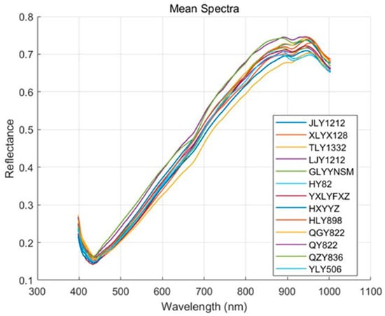 Figure 3 illustrates the mean spectral reflectance of 13 rice varieties across the 397–1003 nm wavelength range. The spectral curves of all rice varieties display similar trends, with distinct features observed in specific wavelength regions. In the blue light range (400–500 nm), reflectance is relatively low, likely due to strong absorption by surface compounds such as flavonoids, anthocyanins, and other phenolic compounds in the rice husk [31]. In the green light region (500–600 nm), reflectance slightly increases, likely due to reduced pigment absorption and enhanced surface scattering. In the 600–800 nm region, reflectance increases rapidly, showing a characteristic “red edge” feature. This sharp rise in reflectance is linked to changes in the internal structure of the rice grain and increased scattering of near-infrared light. In the near-infrared region (800–1000 nm), reflectance stabilizes, reflecting weak absorption by internal components such as starch and proteins, along with strong scattering from the grain structure [32]. Around 930 nm, some varieties show a slight decrease in reflectance, corresponding to water absorption features in the grain, a typical characteristic in the near-infrared region [33]. While the spectral curves are highly similar across varieties, subtle differences exist in certain features, such as the green light peak around 550 nm, variations in the red edge around 750 nm, near-infrared plateau reflectance between 800 and 950 nm, and absorption depth near 970 nm. These differences may result from variations in husk pigment composition, grain density, chemical composition, and moisture content [34], offering useful insights for subsequent feature selection and classification modeling.