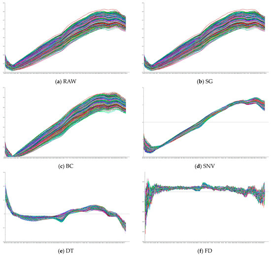 Spectral characteristic curves after different preprocessing methods: (a) RAW; (b) SG; (c) BC; (d) SNV; (e) DT and (f) FD.