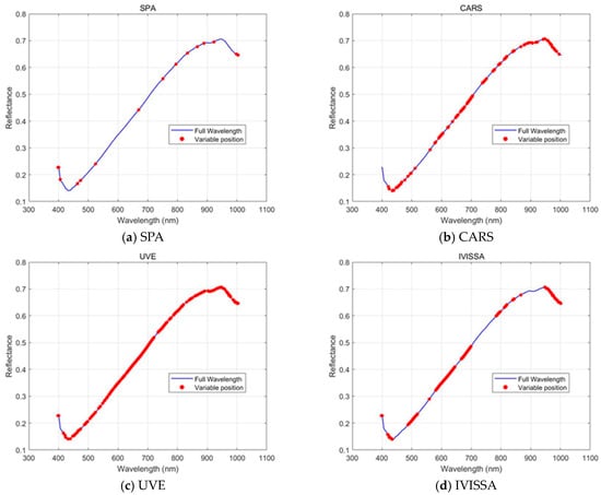 Distribution of selected spectral wavelengths by different feature extraction methods: (a) SPA; (b) CARS; (c) UVE and (d) IVISSA.
