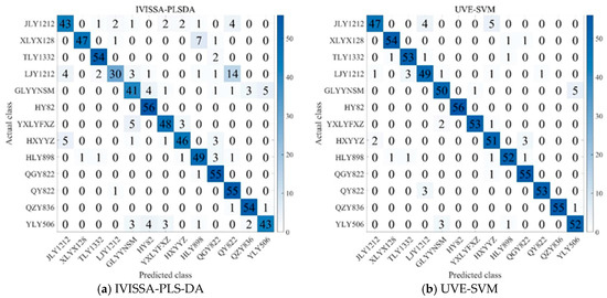 Confusion matrices of different modeling methods with optimal parameters: (a) IVISSA-PLS-DA; (b)UVE-SVM; (c) UVE-1D-CNN and (d) CARS-CNN-Transformer.