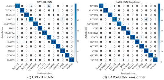 Different modeling algorithms require distinct feature extraction methods to achieve optimal performance [41]. For instance, PLS-DA benefits most from IVISSA, with a 3.02% increase in accuracy. In contrast, SVM and 1D-CNN perform best with UVE, maintaining high performance while reducing dimensionality by 29.02%. Similarly, CNN-Transformer performs well when paired with CARS, reducing data dimensionality by 61.61%, while retaining nearly the same level of classification performance. UVE’s ability to reduce dimensionality while maintaining good performance suggests that this method strikes a balance between dimensionality reduction and classification performance, retaining a sufficient number of important features. However, CARS, which reduces dimensionality by a greater amount, still achieves similar performance, demonstrating that a more significant reduction in data size does not necessarily result in a loss of classification accuracy [42]. This suggests that the key factor is not just the reduction in dimensionality, but whether the modeling algorithm can effectively learn from the most relevant wavelengths and features for classification [43].