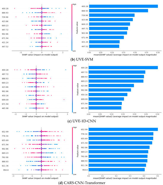 SHAP Analysis of Feature Importance for Different Models: (a) IVISSA-PLS-DA; (b)UVE-SVM; (c) UVE-1D-CNN and (d) CARS-CNN-Transformer.