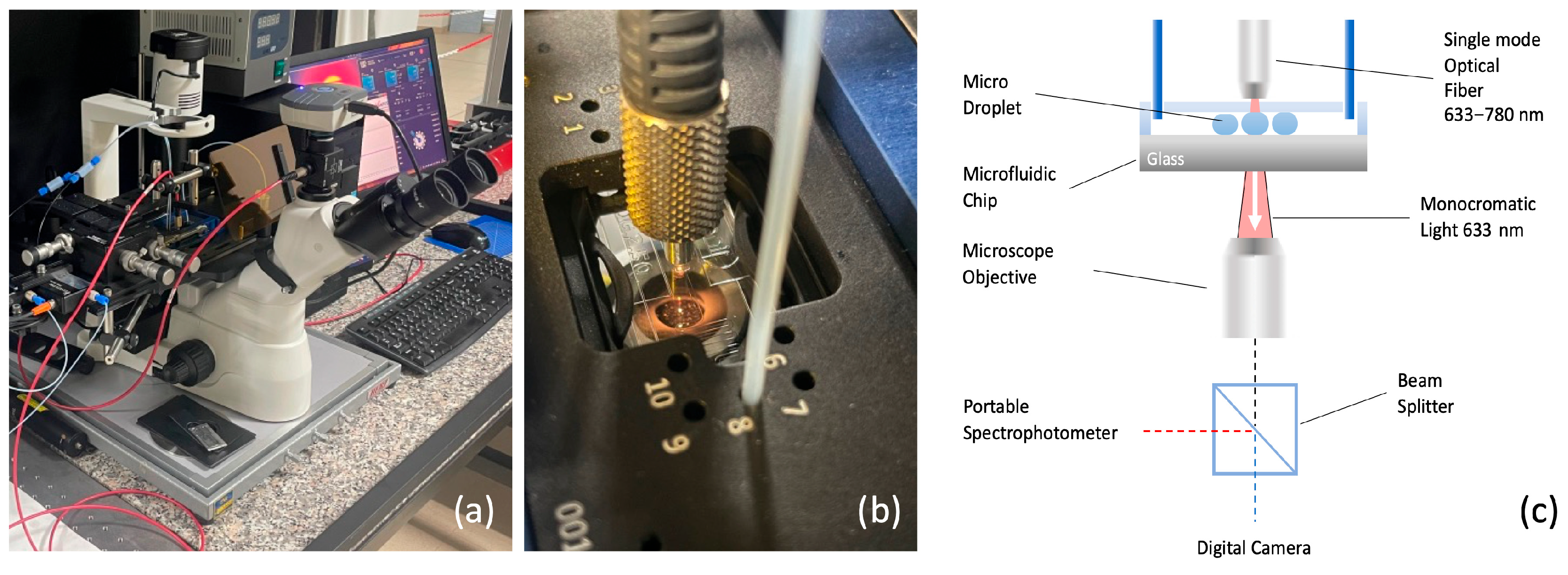 The microscope objective, located directly beneath the microfluidic chip, performs both imaging and absorbance measurements simultaneously, facilitated by a beam splitter. The imaging signal is routed to a high-resolution camera for detailed visualization of the droplets, while the transmitted or emitted radiation from the droplets is directed to a portable spectrophotometer for optical analysis. This dual functionality enables the concurrent collection of visual and spectroscopic data, providing a comprehensive understanding of the optical properties of the droplets.