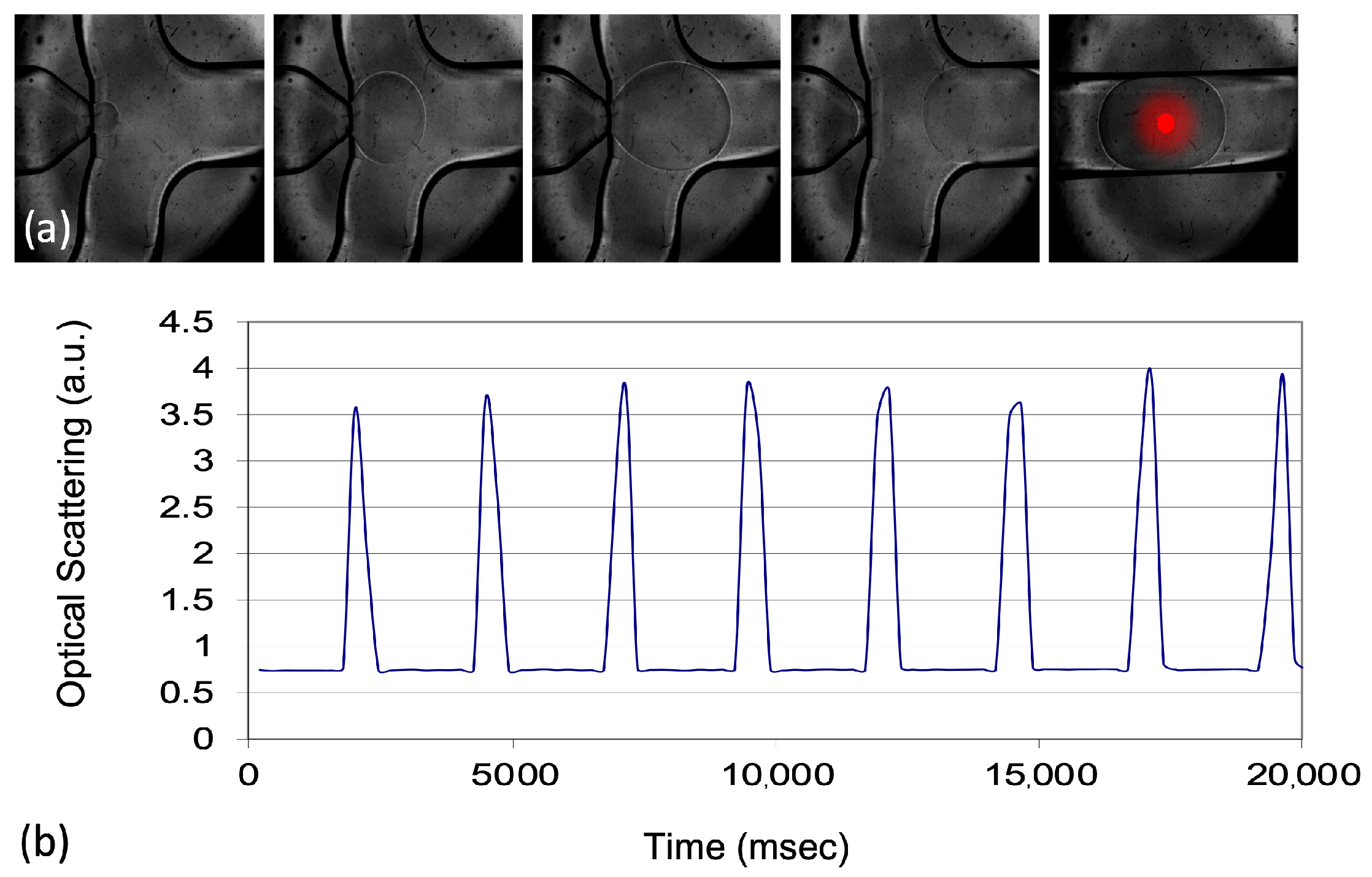 By integrating the absorbance curve over a defined spectral range, it is possible to track the dynamics of each droplet’s passage through the detection zone, thereby distinguishing subtle changes in their optical properties. This method enables a real-time, automated analysis of hundreds or even thousands of droplets, as variations in absorbance signal can be monitored dynamically over time. Such analysis allows for a detailed statistical study of droplet populations, which highlights how shifts in optical properties can be effectively discriminated through this calibrated approach. This capability is particularly beneficial for applications requiring high-throughput analysis and precise monitoring of sample changes, such as in LAL testing.