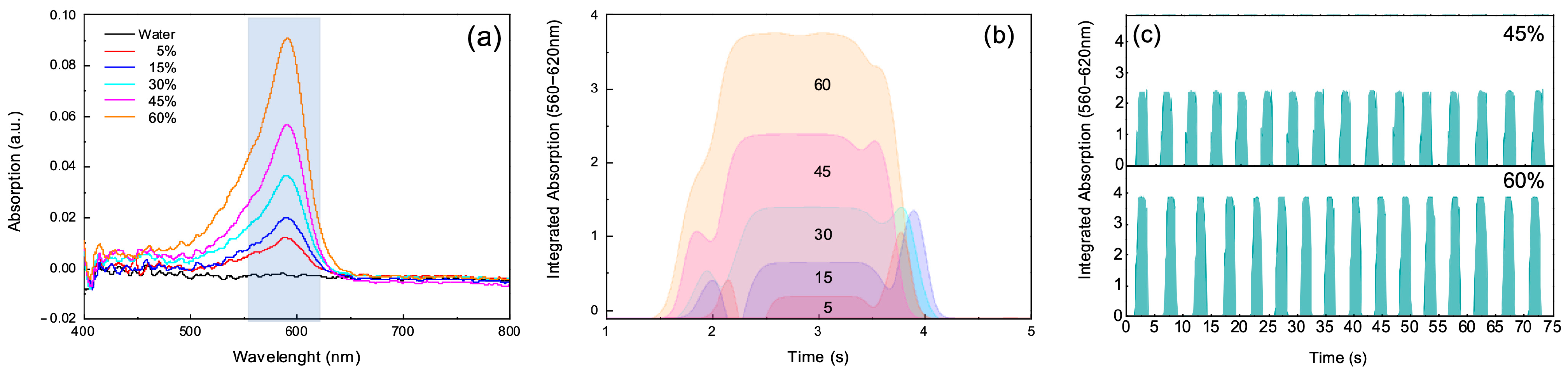 This approach was designed to simulate the presence of chromogenic elements within the droplets, such as those used in Limulus Amebocyte Lysate (LAL) tests. By calibrating the system with these known dye concentrations, it is possible to establish a baseline optical response, ensuring accurate measurement of the optical properties of droplets during subsequent LAL tests.