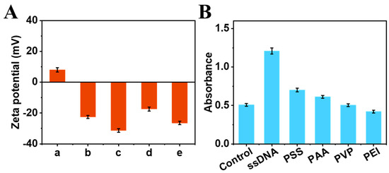 The enhancing effect of ssDNA on the catalytic activity of the MoS2-PBNCs-AuNPs nanozymes was studied. As shown in Figure 2A, the zeta potential of MoS2-PBNCs-AuNPs (column b) shifted from −22.50 mV to −31.29 mV with the addition of ssDNA (column c), confirming the successful adsorption of ssDNA onto the nanozyme. It is noted that TMB carries a positive charge (+8.03 mV, column a) in acetate buffer (pH 4.0), which can adsorb onto the surface of MoS2-PBNCs-AuNPs nanozymes (column d) and ssDNA-functionalized MoS2-PBNCs-AuNPs nanozymes (column e) via electrostatic interaction. Obviously, ssDNA/MoS2-PBNCs-AuNPs nanozymes have more negative charges, meaning they can adsorb the more positively charged TMB substrate to generate higher catalytic performance. To better understand the effect of surface charge on the catalytic activity of MoS2-PBNCs-AuNPs nanozymes, we compared ssDNA with other polymers, including polystyrene sulfonate (PSS), polyacrylic acid (PAA), polyvinylpyrrolidone (PVP), and polyetherimide (PEI). Figure 2B shows that MoS2-PBNCs-AuNPs nanozymes functionalized with negatively charged molecules (ssDNA, PSS, PAA) exhibited enhanced catalytic performance. Meanwhile, MoS2-PBNCs-AuNPs nanozymes decorated with positively charged PEI showed a decrease in catalytic performance. Interestingly, the catalytic activity of uncharged PVP functionalized MoS2-PBNCs-AuNPs nanozymes was almost the same as MoS2-PBNCs-AuNPs nanozymes. It should be noted that ssDNA-functionalized MoS2-PBNCs-AuNPs nanozymes showed the best catalytic activity toward TMB oxidation in this work.