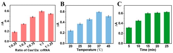 To obtain the best sensing performance, the effects of different experimental conditions on the CRISPR-enhanced colorimetric aptasensor were investigated. At first, the molar ratio of the Cas12a protein and crRNA was studied. It can be found that ∆A of the colorimetric aptasensor increased with an increasing ratio of the Cas12a protein and crRNA. The largest ∆A was obtained when the ratio of the Cas12a protein and crRNA reached 1:1 (Figure 4A). Therefore, the same molar concentrations of Cas12a and crRNA was selected as the optimal condition. Similarly, the maximum ∆A was obtained when the reaction temperature was 37 °C (Figure 4B). If the reaction temperature was up to 45 °C, the ∆A of the aptasensor decreased. This is ascribed to the high temperature affecting the catalytic activity of the Cas12a protein. Therefore, the optimal reaction temperature was chosen as 37 °C. Finally, the incubation time of the CRISPR/Cas system was optimized. As shown in Figure 4C, the ∆A of the aptasensor increased with increasing the incubation time over the range of 0–15 min. There was almost no change in ∆A when the reaction time was prolonged to 25 min. To save on the detection time, the optimal incubation time of CRISPR/Cas system was selected as 15 min.