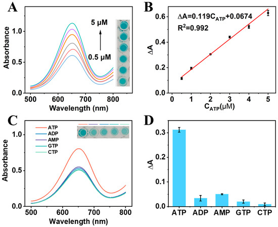 (A) UV–vis absorption spectra and photos of the CRISPR-enhanced colorimetric aptasensor in the presence of ATP at increasing concentrations (0.5, 1, 2, 3, 4, and 5 μM). (B) The linear relationship of ΔA and ATP concentrations. (C) UV–vis curves of the aptasensor for ATP, ADP, AMP, GTP, and CTP detection. Inset: The corresponding solution color of the aptasensor for different molecules detection. (D) The ΔA of the aptasensor for ATP, ADP, AMP, GTP, and CTP detection.