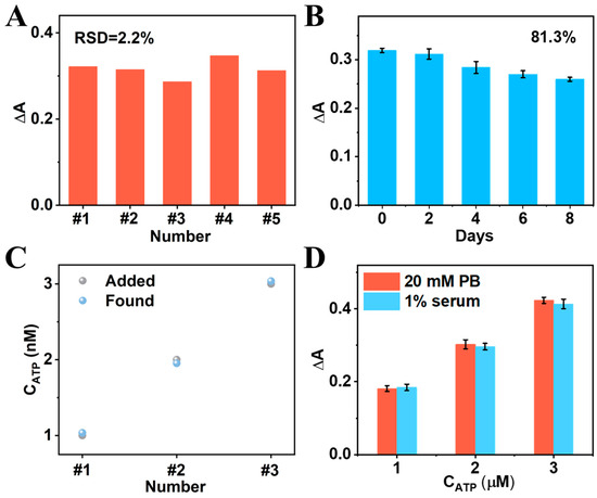 At first, five independent CRISPR-enhanced colorimetric aptasensors were developed to study their reproducibility. The relative standard deviation (RSD) of the five aptasensors for the same concentration of ATP detection was only 2.2%, proving that the designed aptasensor has excellent reproducibility (Figure 6A). After 8 days of storage, the ΔA of the aptasensor was still 81.3% of the initial value (Figure 6B), suggesting that the aptasensor has good storage stability. Subsequently, the standard addition method was used to evaluate the practical application of this CRISPR-enhanced colorimetric aptasensor. As shown in Figure 6C, the recoveries and RSD of the aptasensor for detecting clinically relevant ATP concentrations (1 μM, 2 μM, and 3 μM) in serum were about 95.06–99.50% and 3.53–6.16%, respectively, indicating that the designed colorimetric aptasensor is promising for practical application. In addition, the ΔA of the aptasensor for the same concentrations of ATP detection in 1% serum samples and in ideal PB buffer are almost the same, further suggesting that the developed aptasensor has good anti-interference ability and potential for application in clinical samples (Figure 6D).