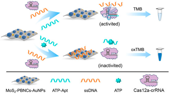 Nanozymes, especially Prussian blue-based nanozymes, have been widely used in the development of colorimetric biosensors for detecting target molecules due to their outstanding catalytic properties and excellent chemical stability [37,38,39]. Inspired by the above exciting works, a CRISPR-enhanced colorimetric aptasensor was developed for the detection of ATP by coupling, with the advantages of aptames and MoS2-based nanozymes. As shown in Scheme 1, a Prussian blue nanocube and gold nanoparticle co-functionalized molybdenum disulfide (MoS2-PBNCs-AuNPs) nanozyme with high peroxidase-like activity was synthesized; and it was employed to catalyze 3,3′,5,5′-tetramethylbenzidine (TMB) in the presence of hydrogen peroxide (H2O2). Correspondingly, an obvious colorimetric signal was generated. Importantly, the catalytic performance of MoS2-PBNCs-AuNPs nanozymes was enhanced with the adsorption of single-stranded DNA (ssDNA). In the absence of ATP, ATP aptamer (ATP-Apt) hybridized with crRNA to activate the cleave activity of the Cas12a protein. As a result, the adsorbed ssDNA was cleaved to small fragments by Cas12a, leading to the desorption of ssDNA from the nanozyme surface. Correspondingly, a light-blue solution color and low absorption peak were observed due to the decrease in the catalytic activity of the nanozymes. In the presence of ATP, ATP competitively binds to ATP-Apt due to the high affinity, causing less Cas12a to be activated. Obviously, a blue solution and high absorption peak, located at 652 nm, were obtained. According to this concept, the CRISPR-enhanced colorimetric aptasensor can qualitatively and quantitatively detect ATP with high performance. Moreover, the designed aptasensor can efficiently analyze ATP in real samples.