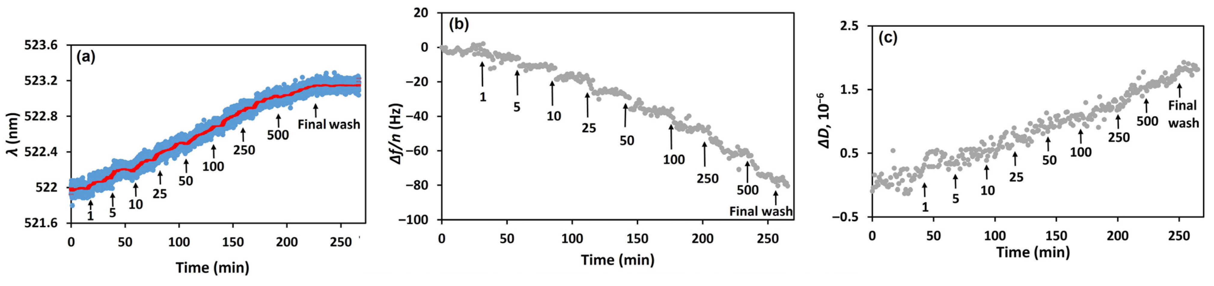 - Asai, N.; Matsumoto, N.; Yamashita, I.; Shimizu, T.; Shingubara, S.; Ito, T. Detailed analysis of liposome adsorption and its rupture on the liquid-solid interface monitored by LSPR and QCM-D integrated sensor. Sens. Bio-Sens. Res. 2021, 32, 100415. [Google Scholar] [CrossRef]