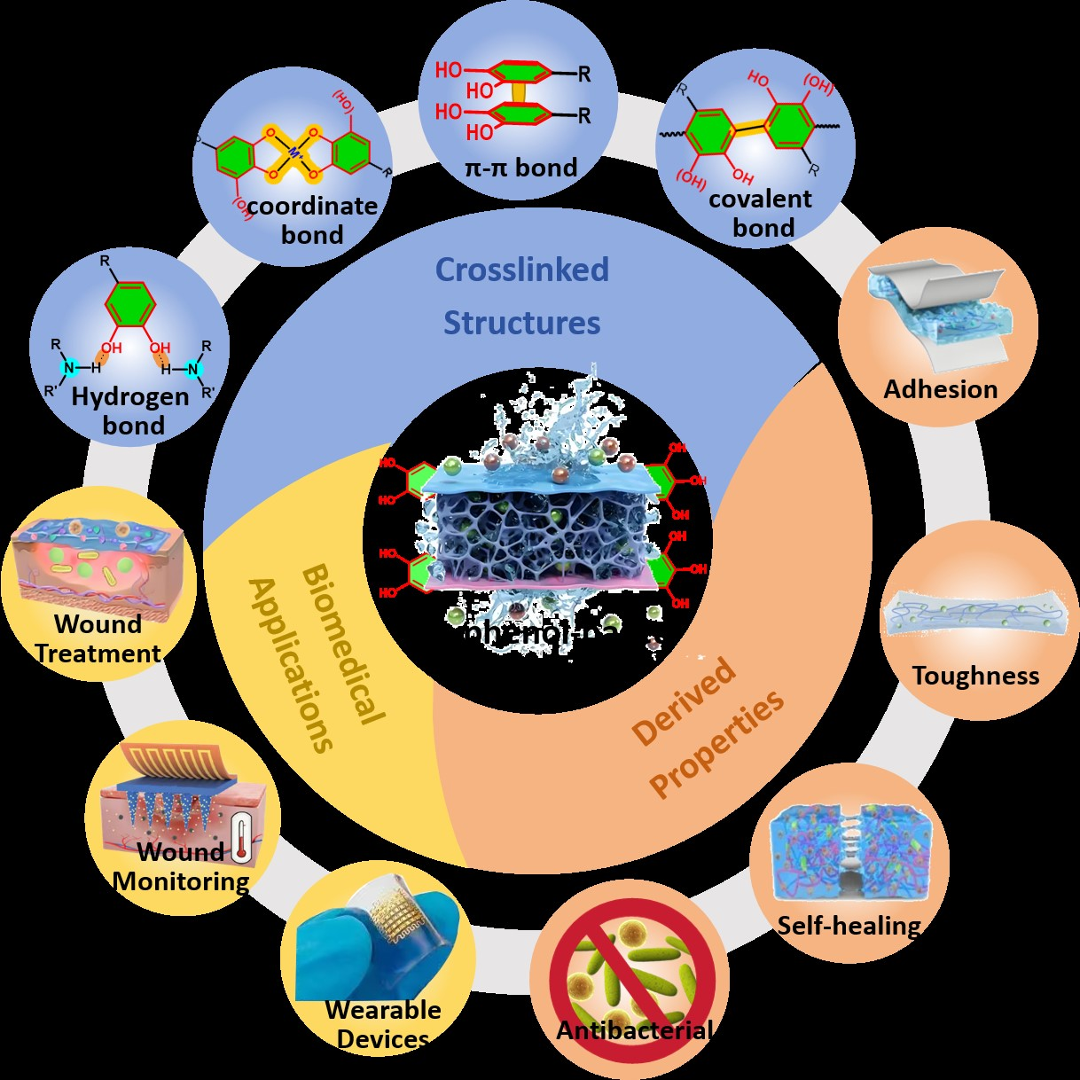 - Xing, Q.; Zhen, L.; Zhou, X.; Zhong, S.; Li, F.; Li, J.; Meng, R.; Duan, P.; Luo, J.; Yang, J. Cohesion Regulation of Polyphenol Cross-Linked Hydrogel Adhesives: From Intrinsic Cross-Link to Designs of Temporal Responsiveness. Adv. Funct. Mater. 2025, 35, 2414294. [Google Scholar] [CrossRef]