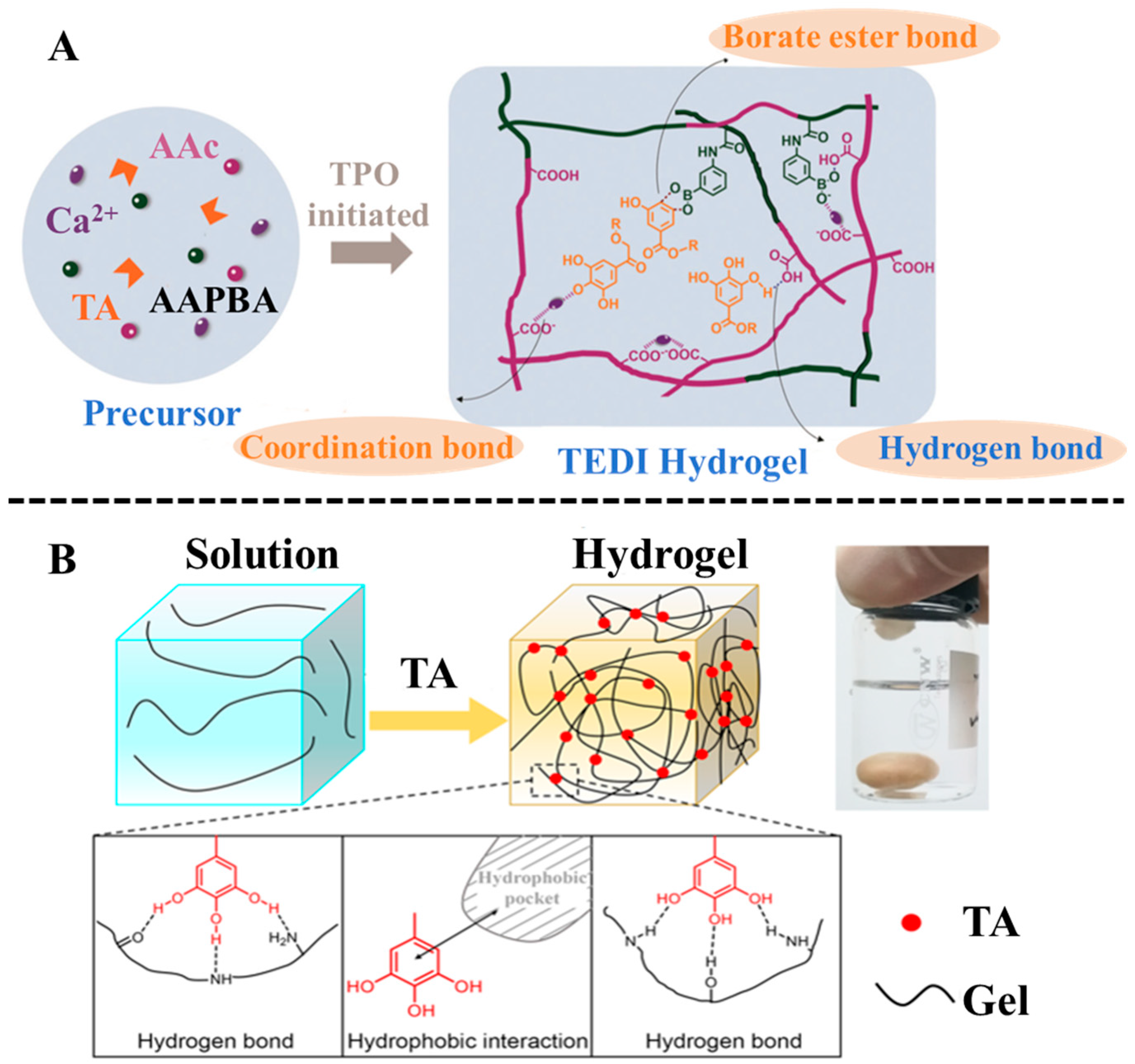 - Mo, J.; Dai, Y.; Zhang, C.; Zhou, Y.; Li, W.; Song, Y.; Wu, C.; Wang, Z. Design of ultra-stretchable, highly adhesive and self-healable hydrogels via tannic acid-enabled dynamic interactions. Mater. Horiz. 2021, 8, 3409–3416. [Google Scholar] [CrossRef] [PubMed]
