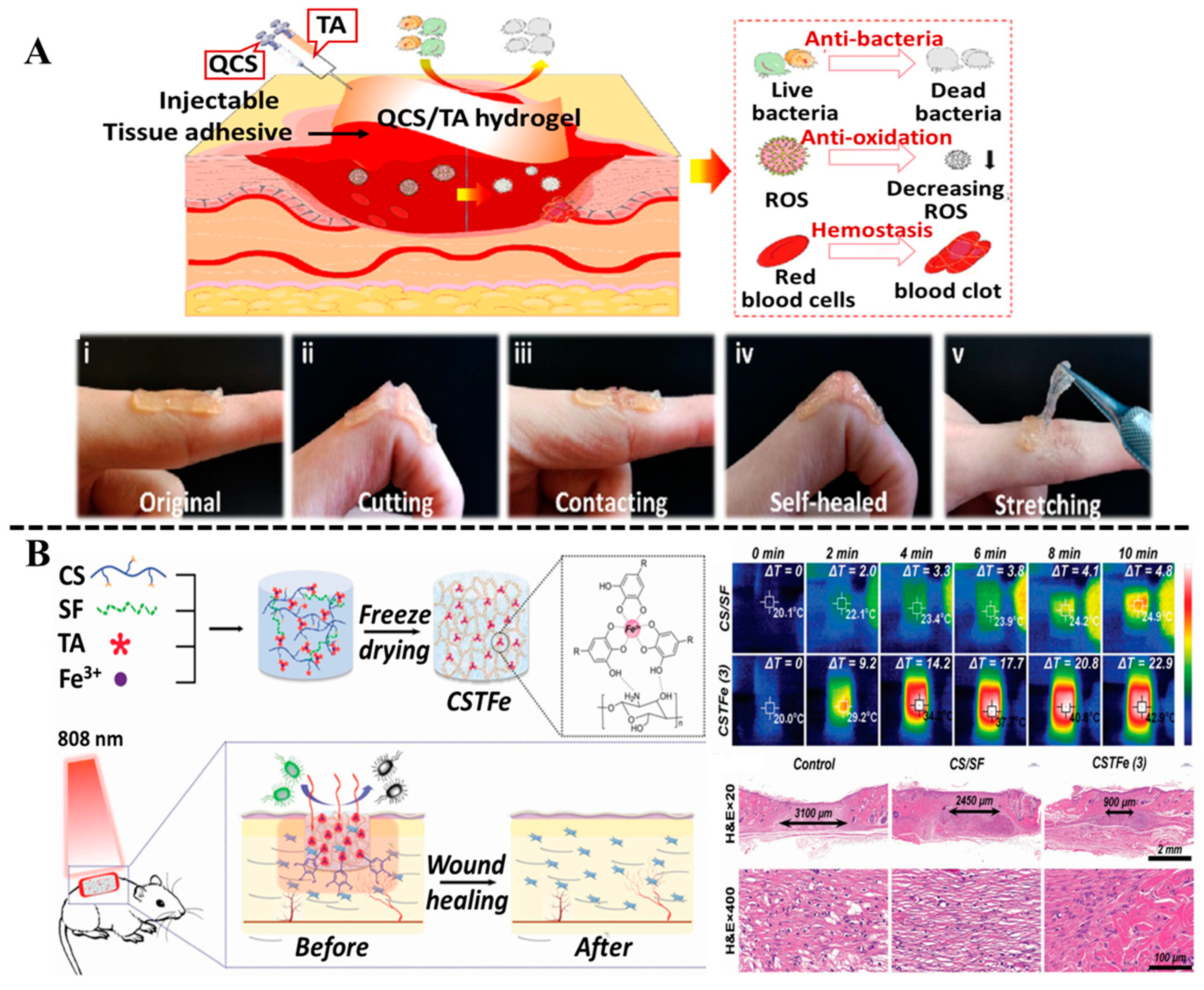 - Yang, K.; Zhou, X.; Li, Z.; Wang, Z.; Deng, L.; He, D. Ultrastretchable, Self-Healable, and Tissue-Adhesive Hydrogel Dressings Involving Nanoscale Tannic Acid/Ferric Ion Complexes for Combating Bacterial Infection and Promoting Wound Healing. ACS Appl. Mater. Interfaces 2022, 14, 43010–43025. [Google Scholar] [CrossRef]