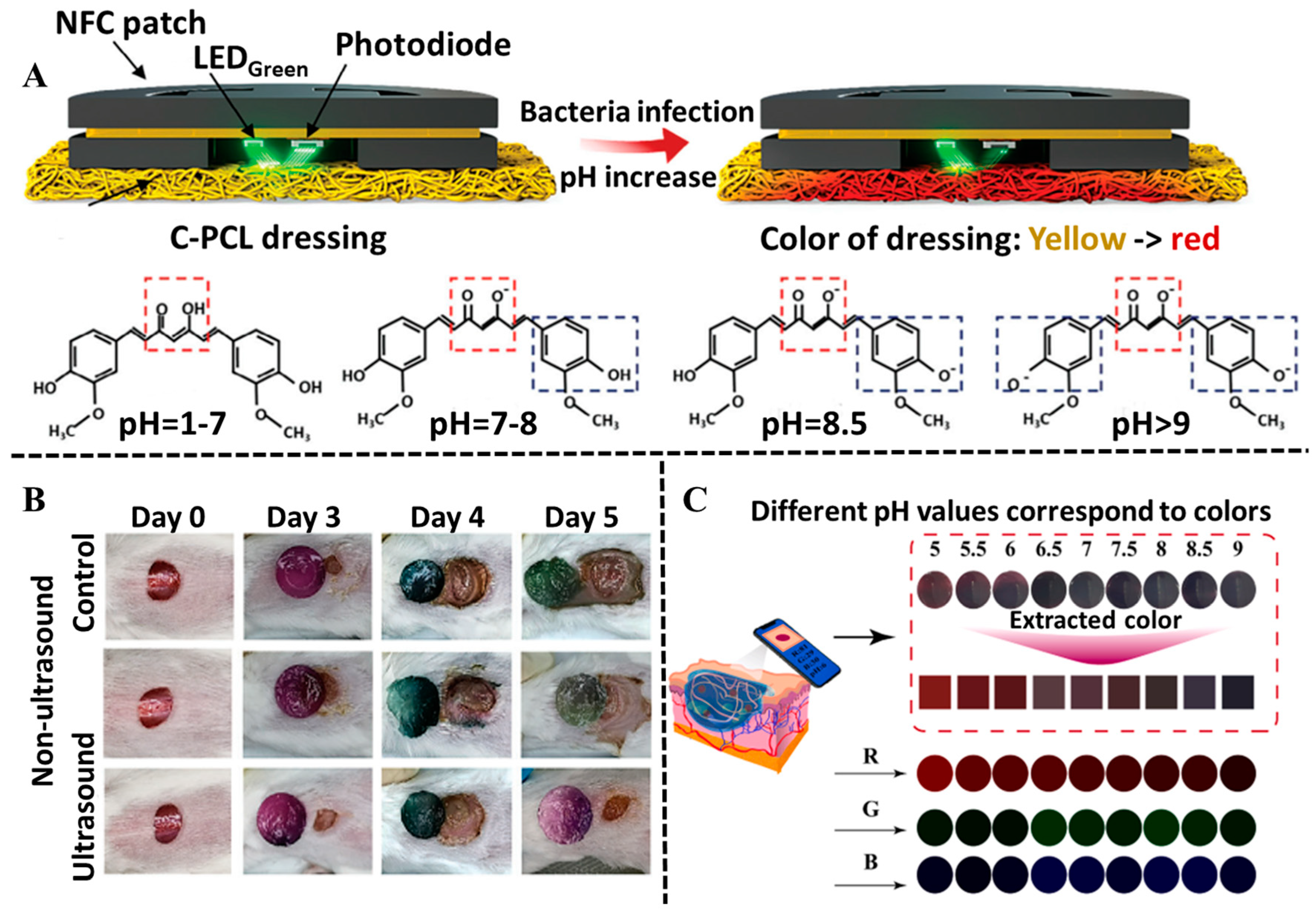 - Huang, D.; Du, J.; Luo, F.; He, G.; Zou, M.; Wang, Y.; Lin, Z.; Wu, D.; Weng, Z. Injectable Hydrogels with Integrated Ph Probes and Ultrasound-Responsive Microcapsules as Smart Wound Dressings for Visual Monitoring and On-Demand Treatment of Chronic Wounds. Adv. Healthc. Mater. 2024, 13, 2303379. [Google Scholar] [CrossRef]