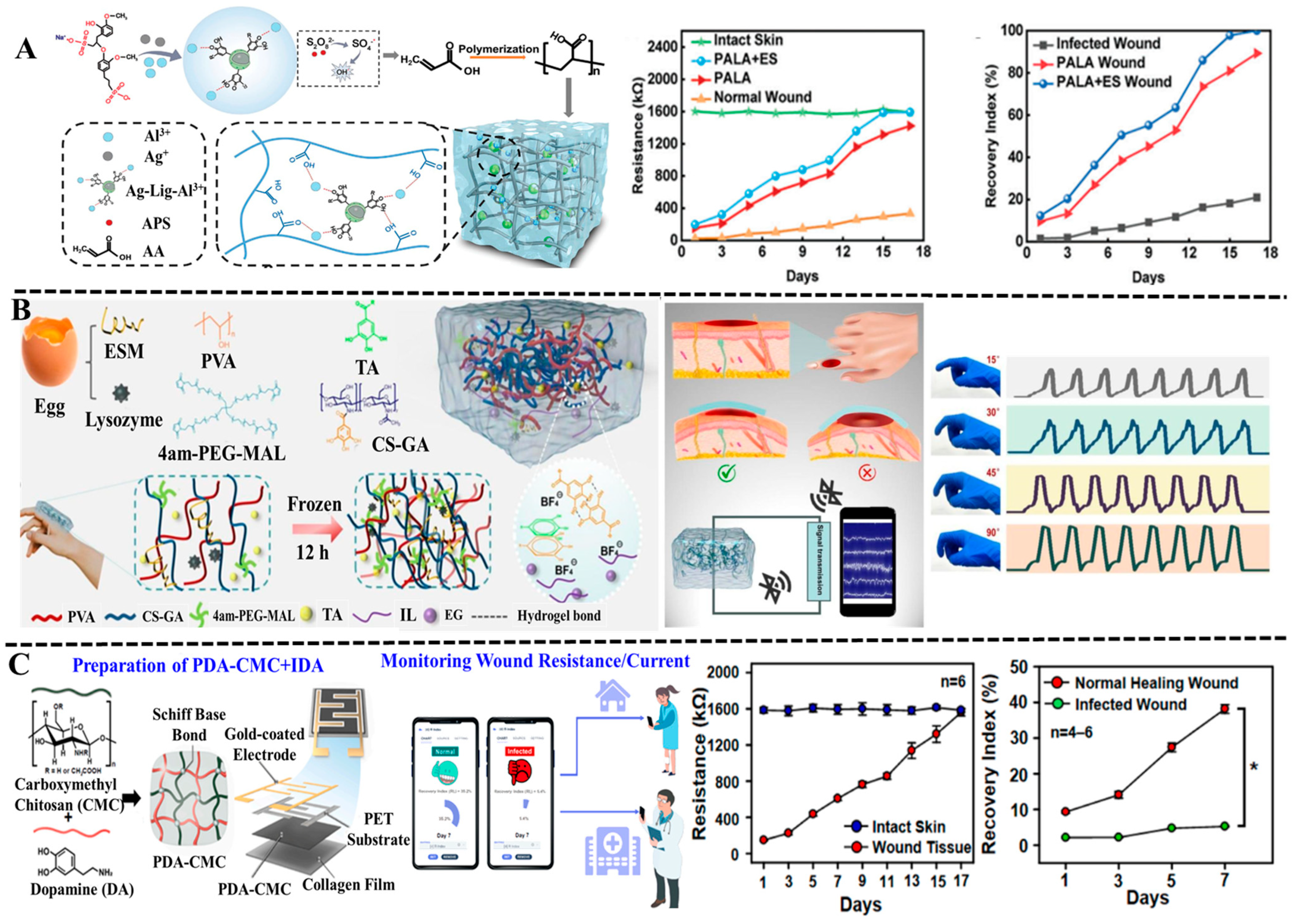 - Yang, Q.; Chen, R.; Li, M.; Song, H.; Zhao, X.; Zhang, L.; Zhou, Y.; Chen, J.; Li, J.; Chen, M. High Antimicrobial Electrotherapy and Wound Monitoring Hydrogel with Bimetal Phenolic Networks for Smart Healthcare. Adv. Funct. Mater. 2025, 35, 2413080. [Google Scholar] [CrossRef]