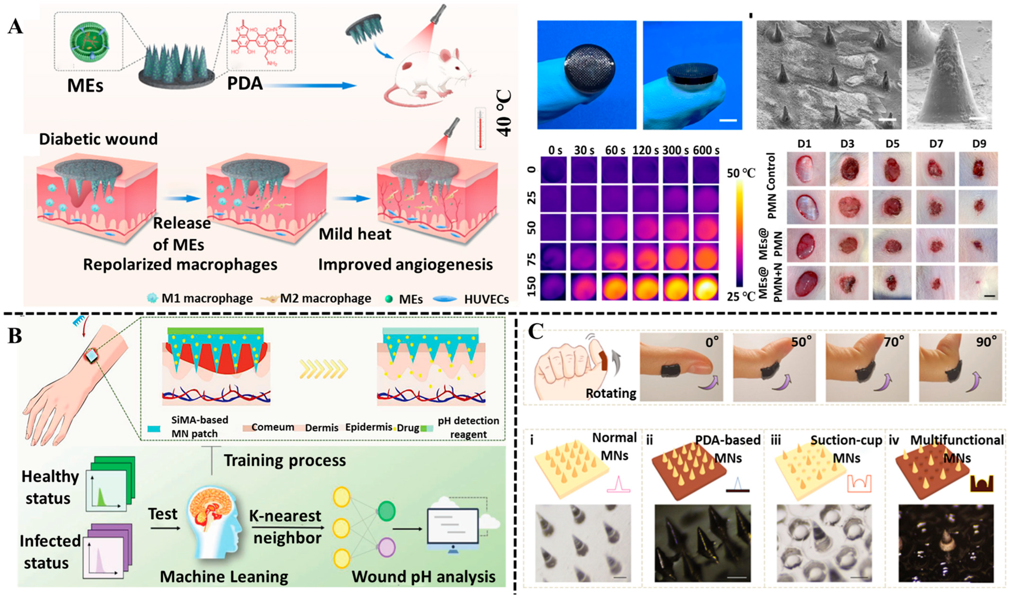 - Zeng, J.; Sun, Z.; Zeng, F.; Gu, C.; Chen, X. M2 macrophage-derived exosome-encapsulated microneedles with mild photothermal therapy for accelerated diabetic wound healing. Mater. Today Bio. 2023, 20, 100649. [Google Scholar] [CrossRef] [PubMed]