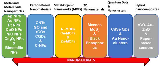 - Malik, S.; Singh, J.; Goyat, R.; Saharan, Y.; Chaudhry, V.; Umar, A.; Ibrahim, A.A.; Akbar, S.; Ameen, S.; Baskoutas, S. Nanomaterials-based biosensor and their applications: A review. Heliyon 2023, 9, e19929. [Google Scholar] [CrossRef]