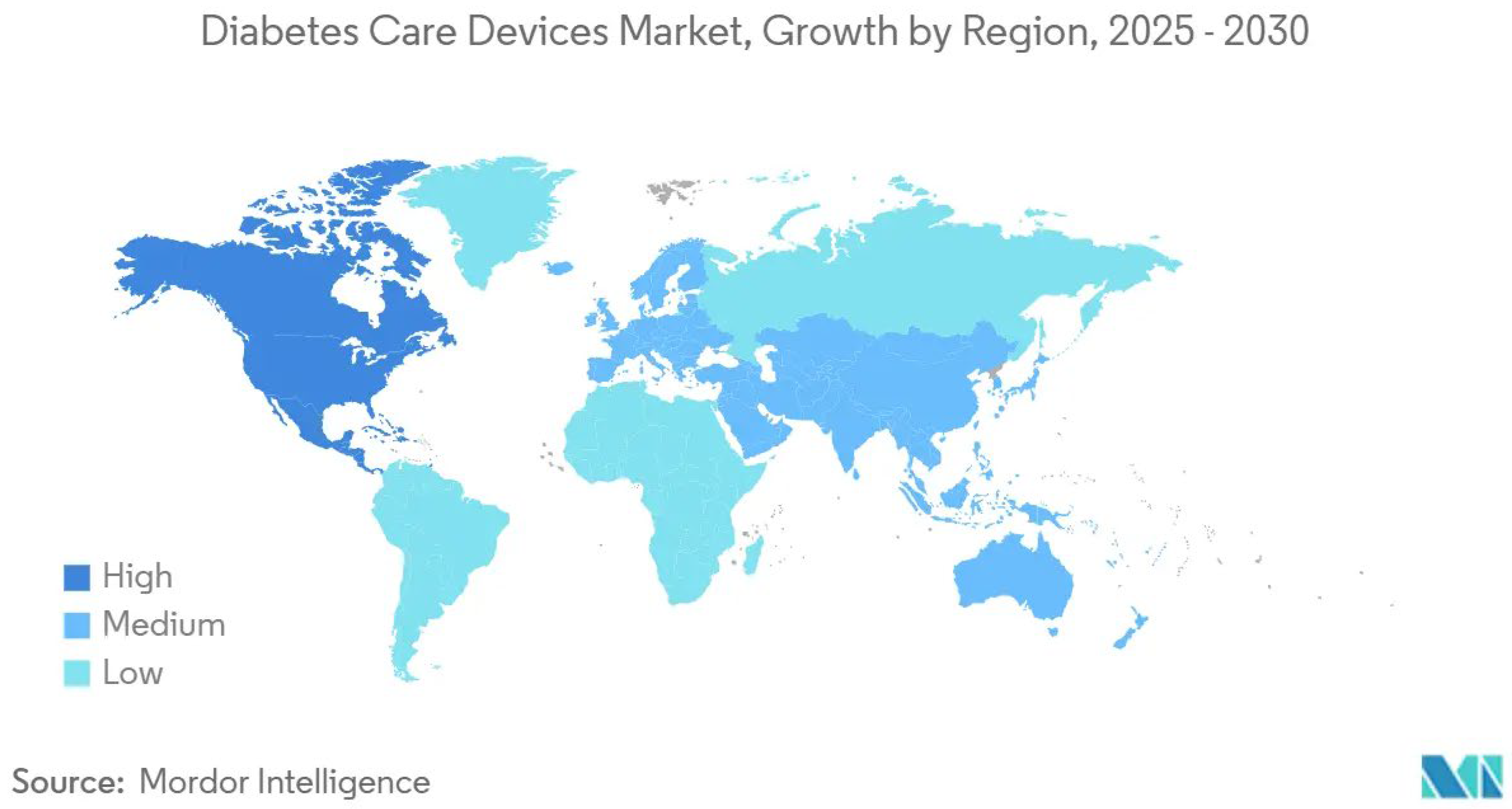 In 2024, North America held 40.7% of the global market, supported by Medicare reimbursement and a high density of trained endocrinologists. The CDC reported 29.7 million diagnosed and 8.7 million undiagnosed diabetes cases, with the latter offering growth potential through pharmacy-linked screening [1]. Yet, rising cost pressures from payers may compress premium continuous glucose monitoring (CGM) prices, steering adoption toward value-based models. The Asia–Pacific region is set for the fastest growth (8.2% CAGR through 2030), fueled by urbanization and the world’s largest diabetes population (Figure 1), representing over 60% of global cases according to the International Diabetes Federation (IDF) diabetes Atlas [2]. The global diabetes care devices market is projected to expand significantly between 2025 and 2030, with the highest growth observed in North America and Australia, driven by advanced healthcare infrastructure and early adoption of innovative technologies. Europe, Asia–Pacific, and South America are expected to exhibit medium growth, supported by rising diabetes incidence and increasing awareness of glucose monitoring solutions. Conversely, Africa and parts of the Middle East show relatively low growth, reflecting healthcare access challenges and cost limitations. Its digitally engaged population may favor smartphone-integrated CGMs over earlier models, with companies offering localized AI-driven coaching poised for outsized market gains. In Europe, growth remains steady, sustained by universal healthcare and aging demographics. The EMA’s stricter trial demands slow commercialization, but the Abbott–Dexcom patent settlement has removed legal uncertainty. The patent settlement between Abbott and Dexcom marked a major milestone in the CGM market, while stringent FDA regulations continue to pose challenges that can delay the commercialization of medical devices [3]. With clearer procurement timelines, hospitals are likely to negotiate bulk-purchase discounts, compressing prices while boosting adoption.