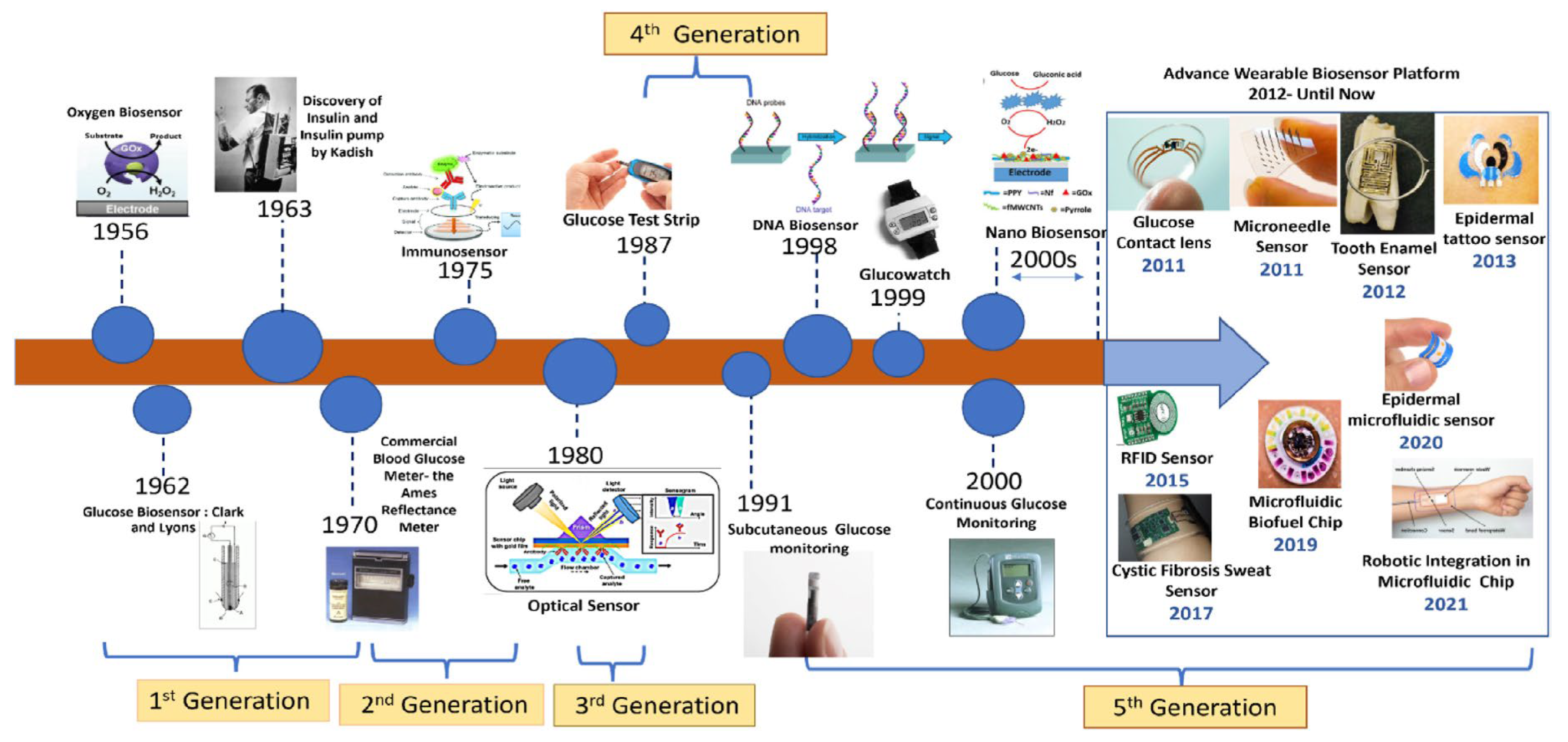The development of glucose biosensors has progressed through five distinct generations, each driven by advances in science and technology to overcome the limitations of earlier systems. The first generation (1962–1970s) began with the pioneering glucose biosensor based on the Clark oxygen electrode (1962) and the discovery of immobilized enzymes (1963) by Leland C. Clark and Champ Lyons. These early devices relied on the natural oxygen consumption of glucose oxidase reactions but were hindered by oxygen dependence and interference from electroactive species. The second generation (1970s–1980s) addressed these limitations through mediator-based biosensors, enabling electron transfer independent of oxygen. This era marked the commercialization of glucose biosensors (1975) for self-monitoring of blood glucose and the emergence of optical sensors in the 1980s, which laid the foundation for portable, home-use glucose meters. The third generation (1980s–1990s) was characterized by direct electron transfer between the enzyme and electrode, leading to greater accuracy and reliability. The introduction of glucose test strips in 1987 revolutionized convenience and portability, while the early 1990s saw the concept of subcutaneous glucose monitoring, paving the way for minimally invasive devices. The fourth generation (2000s–2010s) witnessed a transformative integration of nanotechnology and DNA-based sensing strategies. Key milestones included the introduction of DNA sensors and devices like the GlucoWatch (1998–1999), followed by continuous glucose monitoring (CGM) systems in the early 2000s. With the expansion of nanobiosensors, detection sensitivity and device miniaturization have significantly improved. From 2011 onwards, a new wave of advanced wearable platforms emerged, such as glucose contact lenses (2011), microneedle sensors (2011), tooth enamel tattoo sensors (2012), epidermal tattoo sensors (2013), RFID sensors (2015), cystic fibrosis sweat sensors (2017), microfluidic biofuel chips (2018), epidermal microfluidic sensors (2020), and robotic integration in microfluidic chips (2021). The fifth generation of glucose biosensors (present–future) represents a paradigm shift toward smart, non-invasive, and fully integrated biosensing platforms. Current advancements emphasize the development of wearable, implantable, and lab-on-chip systems that provide continuous, real-time monitoring while minimizing patient discomfort. These next-generation devices are designed to support personalized medicine by enabling tailored treatment strategies and seamless wireless data transmission. Moreover, the integration of artificial intelligence (AI), the Internet of Things (IoT), and robotics into biosensing platforms is paving the way for predictive healthcare, where real-time data analytics not only monitor glucose fluctuations but also anticipate dysglycemic events, thus offering proactive and precision-driven disease management.