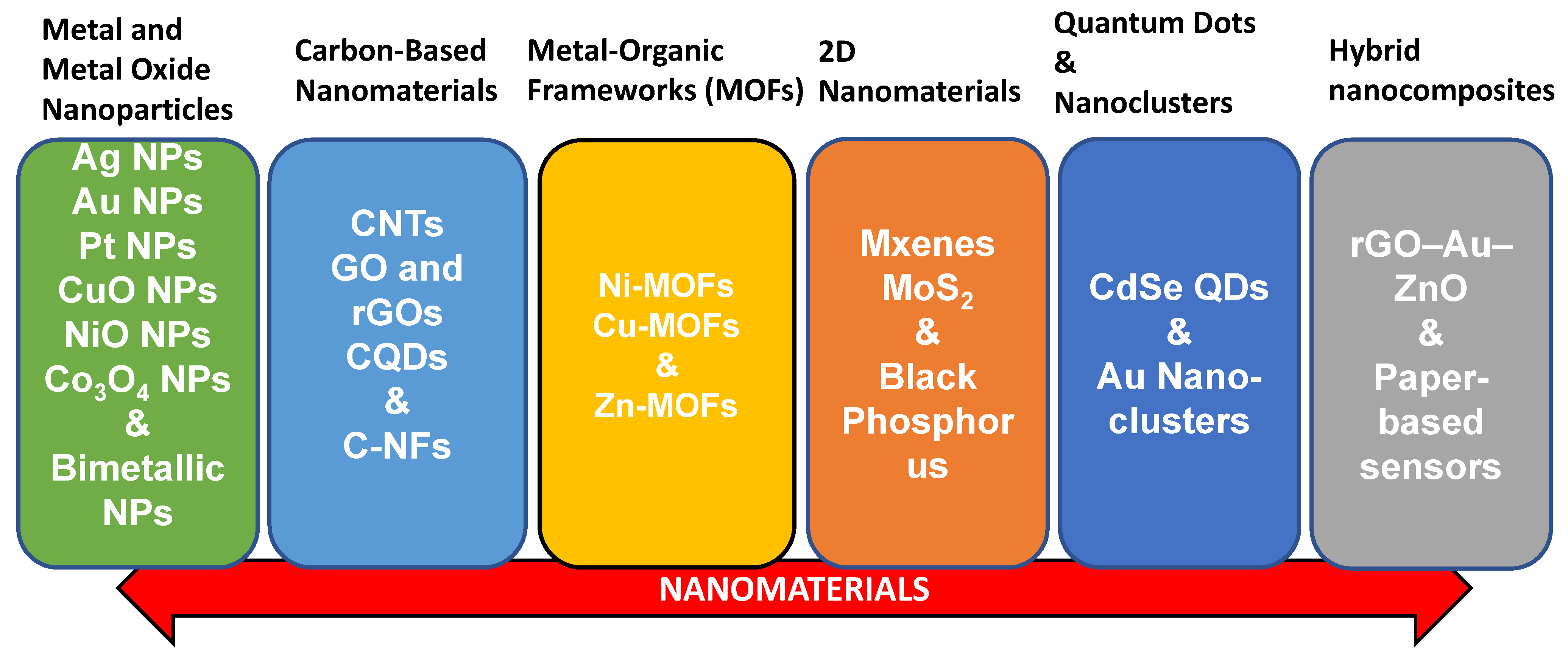 Nanotechnology has revolutionized glucose sensing, offering innovative strategies to enhance sensitivity, lower detection limits, shorten response times, and enable the development of miniaturized devices suitable for point-of-care and personalized healthcare. The integration of nanomaterials has been particularly influential, as their unique physicochemical properties, such as high surface area, tunable morphology, superior conductivity, and strong catalytic activity, facilitate efficient electron transfer while improving biocompatibility. Metal nanoparticles (e.g., gold, silver, platinum, nickel, copper) are widely employed to amplify electrochemical signals and boost catalytic activity. Carbon-based nanostructures, including carbon nanotubes (CNTs), graphene, and graphene oxide, contribute high conductivity, chemical stability, and versatile scaffolds for enzyme or mediator immobilization. More recently, two-dimensional (2D) materials such as transition metal dichalcogenides (TMDs) and MXenes have expanded opportunities for next-generation biosensors, leveraging their layered architectures, high electron mobility, and tunable surface chemistry. Collectively, these nanotechnology-driven innovations not only elevate the analytical performance of glucose biosensors but also drive the development of flexible, wearable, and non-invasive monitoring systems, aligning with the increasing demand for continuous glucose monitoring and personalized diabetes management. This review focuses on the above-mentioned important categories as follows (Figure 3).