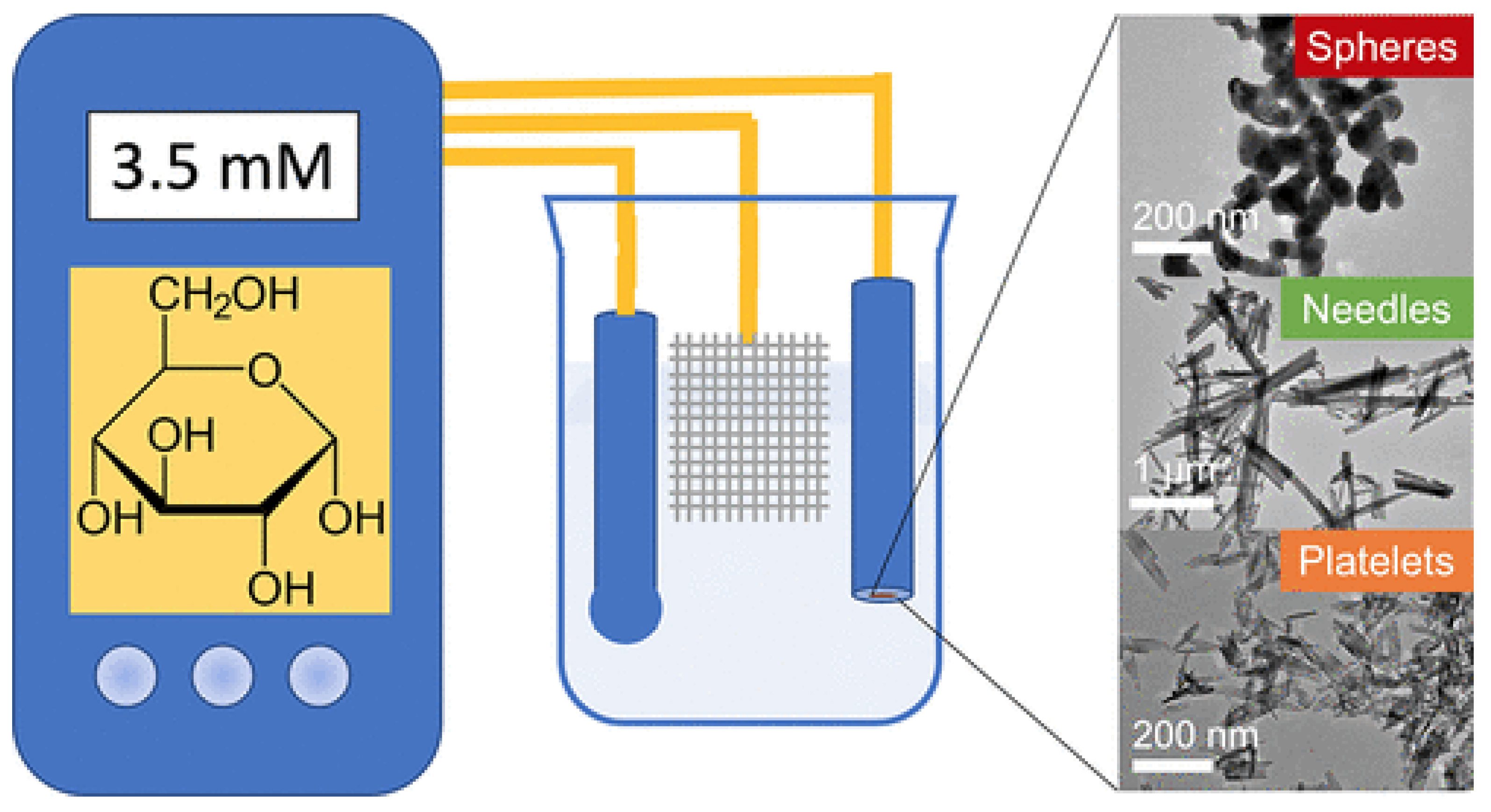 Copper oxide nanoparticles (CuO and Cu2O) have been widely explored for non-enzymatic glucose sensing due to their excellent electrocatalytic activity, low cost, and structural versatility. One study [53] investigated CuO particles with three morphologies: spheres, platelets, and needles by controlling synthesis parameters such as pH, precipitants, calcination, surfactant, and H2O2 addition (Figure 4). Morphology strongly influenced electrocatalytic performance, with needle-shaped CuO NPs providing the highest sensitivity (2.05 mA·mM−1·cm−2), wide linear range (0.05–5 mM), and superior long-term stability. Performance correlated primarily with grain size and capacitance. Another approach [54] fabricated nanostructured Cu2O/CuO electrodes with a columnar morphology using glancing angle deposition followed by thermal annealing. The Cu2O electrodes exhibited a high sensitivity of 1394 μA·cm−2·mM−1, a low LOD (0.052 μM), and two broad linear ranges (0.01–2 mM and 2–5 mM), with excellent reproducibility, selectivity, fast response, and accurate glucose measurements in blood serum. CuO NPs immobilized on mesoporous MCM-41 substrates [55] were developed Via solvothermal methods. The resulting CuO@MCM-41 sensor displayed a rapid 4 s response, high sensitivity (17.23 mA·cm−2·mM−1), a low LOD (16 nM), and a linear range of 83 μM–1.5 mM. Flexible glucose sensors were fabricated using laser-engraved graphene (LEG) electrodes decorated with CuO NPs [56]. These sensors exhibited high sensitivity (619.43 μA·mm−1·cm−2 for 0–3 mM, 462.96 μA·mm−1·cm−2 for 0–8 mM), excellent reproducibility, anti-interference ability, long-term stability, and mechanical flexibility, maintaining 82.4% of the initial current after 100 bending cycles. They also showed promising performance for wearable sweat sensing. CuO nanorods (NRs) were produced Via a two-step anodization method, with crystallite sizes of 17.8–49.6 nm and diameters of 10–60 nm depending on voltage [57]. These nanorods achieved high sensitivities (502.29–783.3 μA·mM−1·cm−2) and low LOD (0.35–0.5 μM). Finally, low-cost, partially flexible CuO microspheroid and urchin films were fabricated on laser-carbonized Nomex sheets for enzyme-free glucose sensing [58]. Cu microspheroids and CuO urchins exhibited high amperometric sensitivity (0.25–0.32 mA·cm−2·mM−1), chemical stability, and reproducibility, demonstrating potential for wearable and microfluidic point-of-care devices.