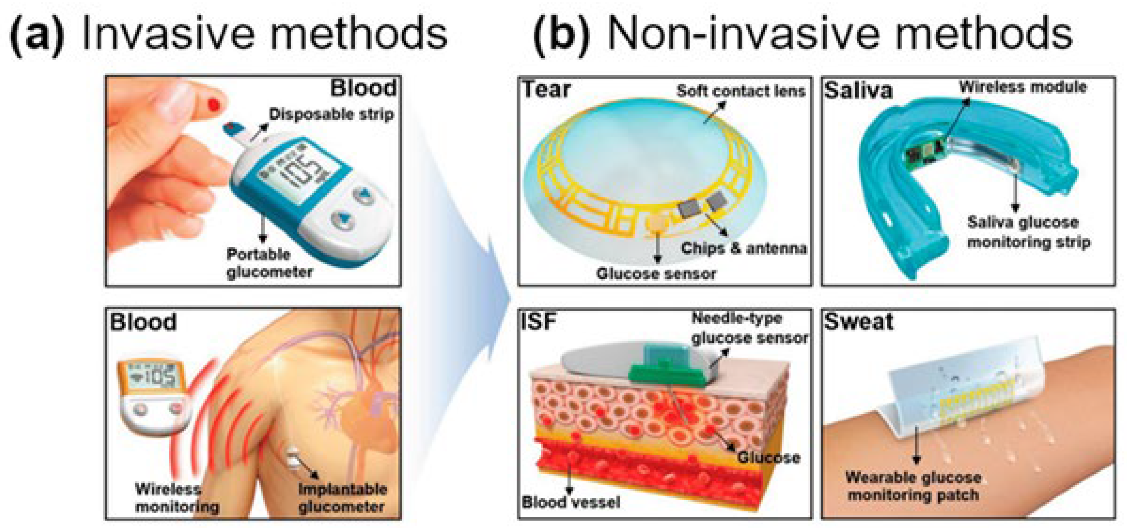 Glucose biosensors are vital in diabetes management, originating from the first enzyme electrode [19]. Over time, they have advanced in sensitivity, selectivity, and accessibility, evolving from simple prototypes to miniaturized, commercially available devices. Modern biosensors can detect glucose in blood, interstitial fluid, and alternative biofluids like sweat and tears, enabling real-time, continuous, and often non-invasive monitoring for improved diabetes care [20].