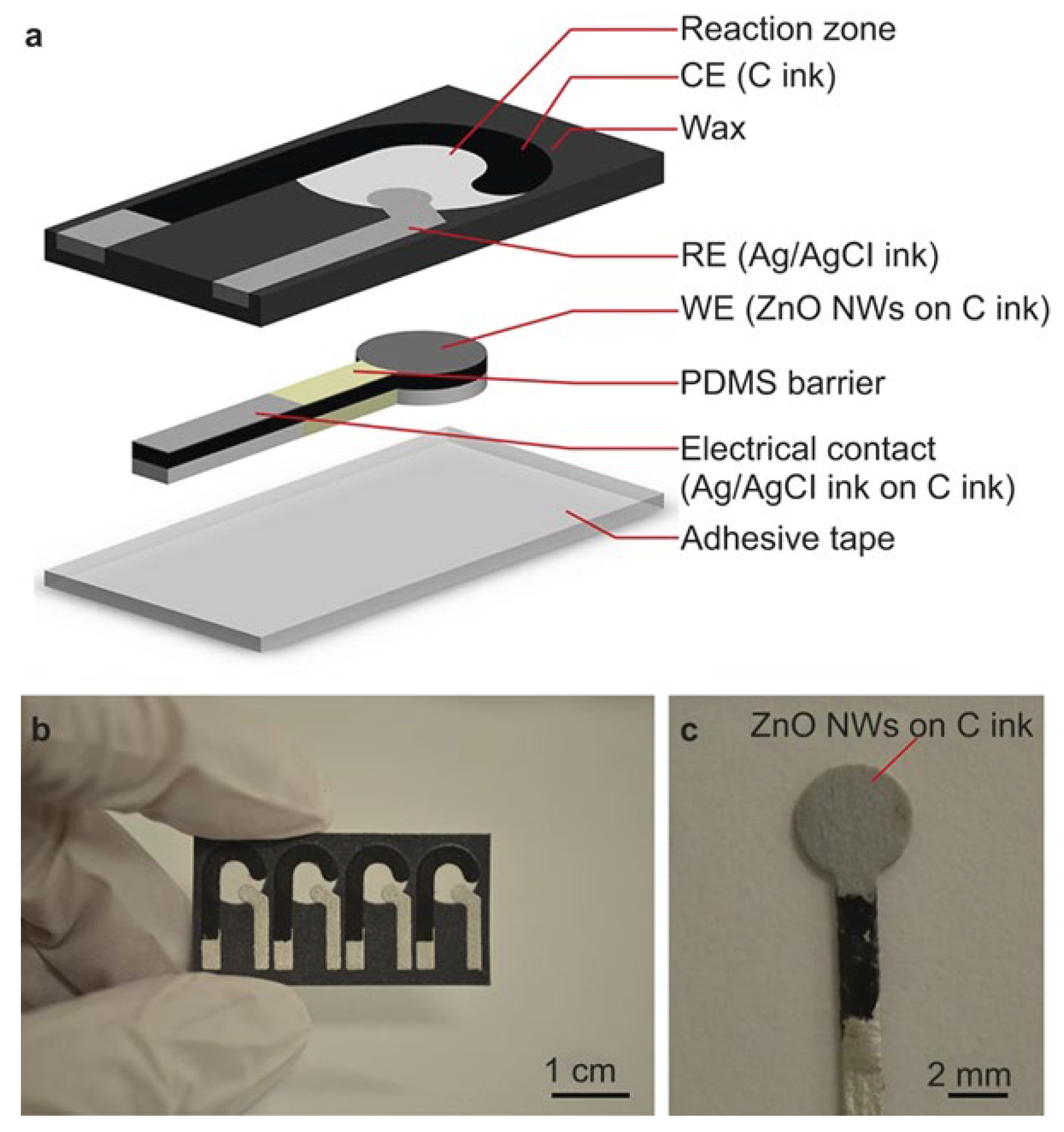 There is increasing interest in non-invasive glucose sensors [82], which can be implanted or applied to the skin to measure glucose in fluids such as sweat, saliva, tears, or interstitial fluid (Figure 5a, and 5b) [83]. GOx immobilized on CNTs provides a highly sensitive electrochemical platform for low-concentration glucose detection [84]. Upon contact, glucose is oxidized to gluconic acid, altering the sensor’s electrochemical properties. Kang, Park, and Ha demonstrated a CNT-based wearable sensor capable of detecting glucose down to 50 μM within 5 s, using faradaic currents from the redox process [85]. While not measuring blood glucose directly, this work confirmed the feasibility of the concept.