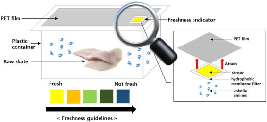 The FI was attached to the bottom of the film inside the skate sashimi packaging. It detected the gradual release of VBN (e.g., MMA, DMA, TMA, and NH3), which led to an increase in pH [16]. In response to VBN accumulation the FI exhibited progressive color changes as shown in Figure 1. Therefore, analyzing the headspace gas in the packaging was an essential part of this study. Skate sashimi was stored at 4 °C to simulate typical household refrigeration conditions.
